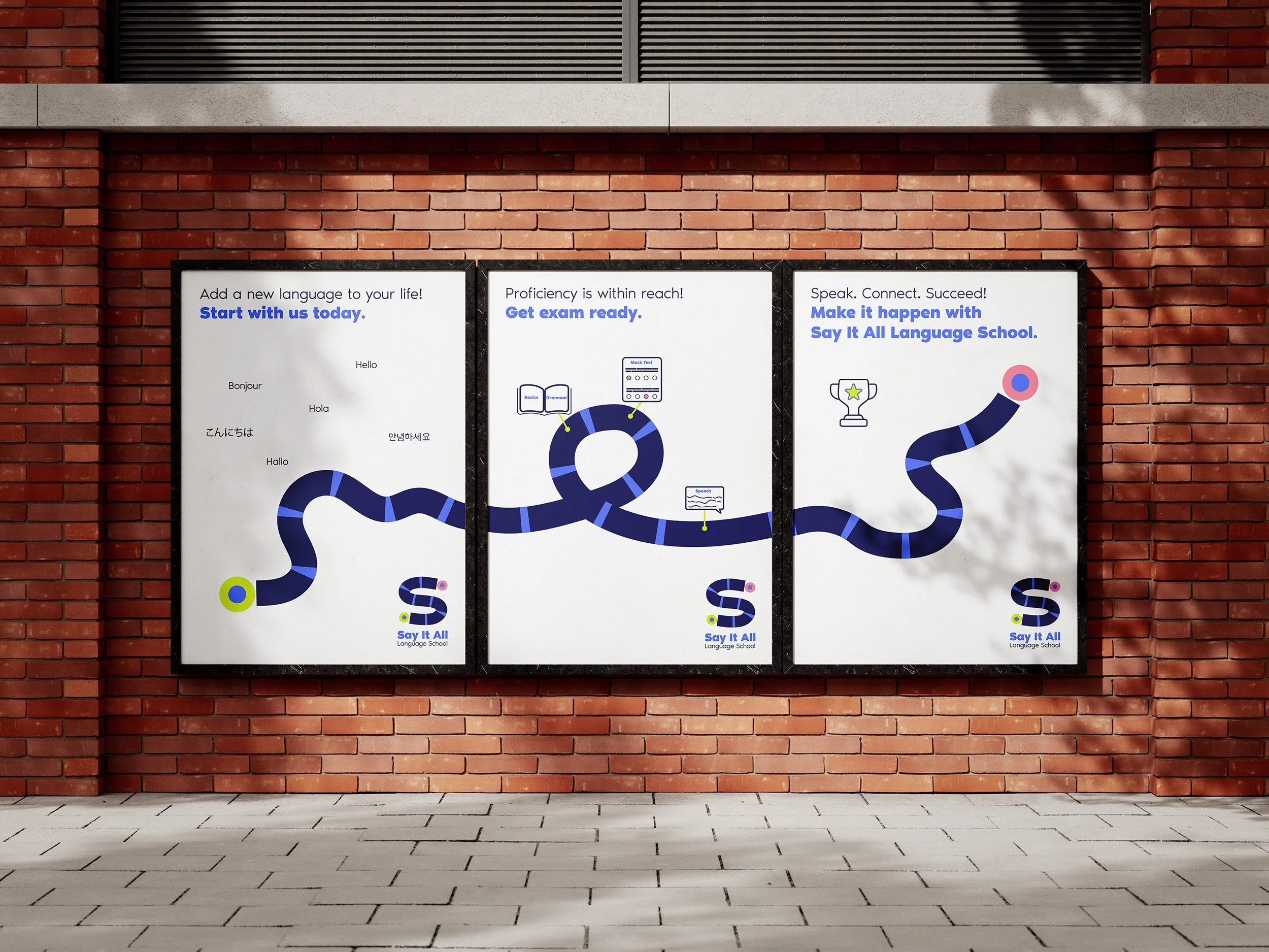 Alongside the logo design, we crafted a cohesive suite of promotional materials—including a billboard, outdoor triptych poster, and a bus stop advertisement—that communicate the school’s multilingual offerings, innovative teaching methods, and commitment to student success.