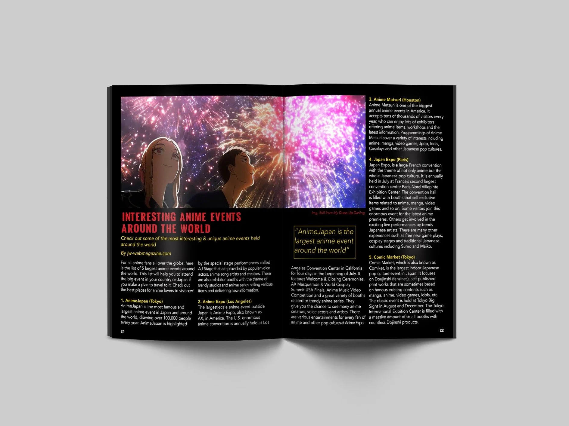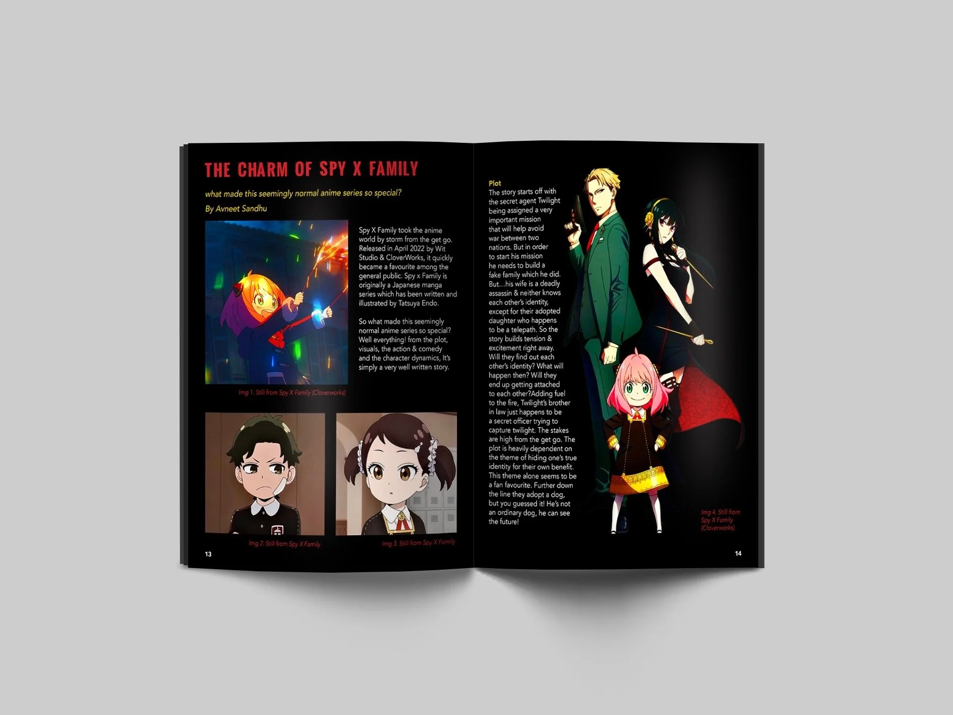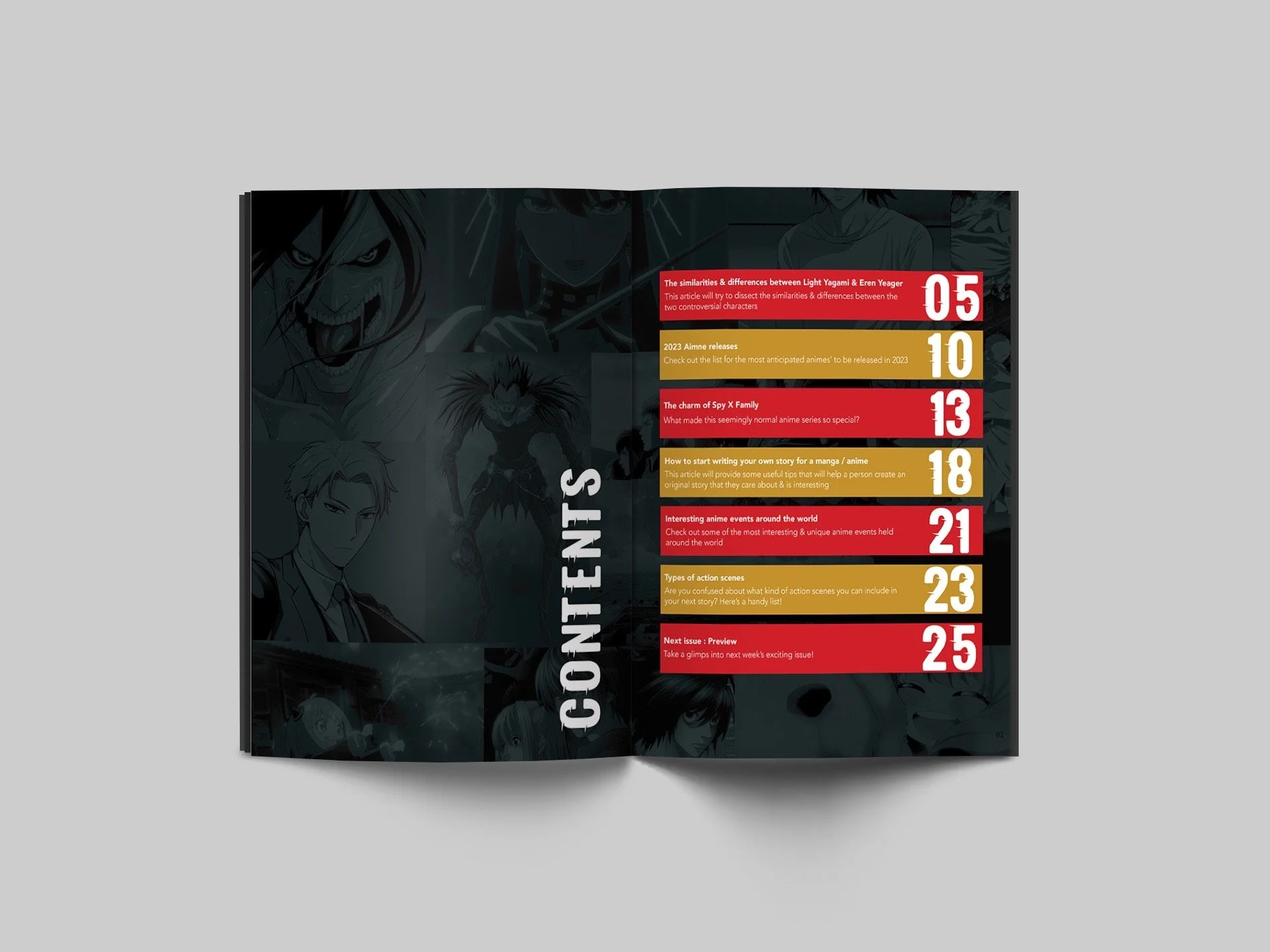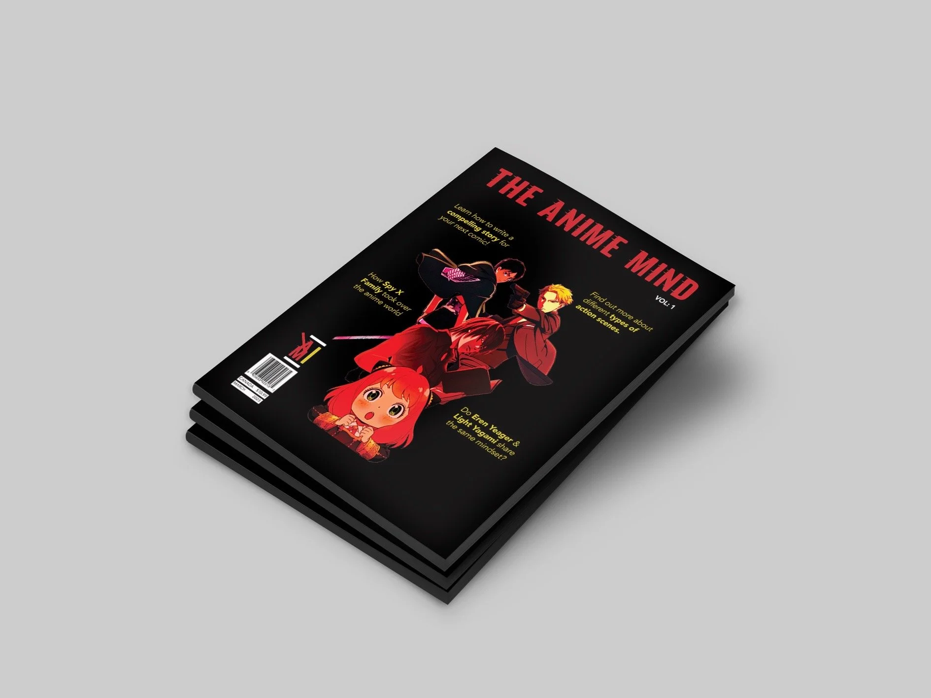 For The Anime Mind, we created a striking and unconventional magazine design that breaks away from typical anime publications. Featuring bold black covers and pages contrasted with vibrant top-page imagery, the magazine draws readers in with high-impact red and yellow headings and crisp white body text for clarity.